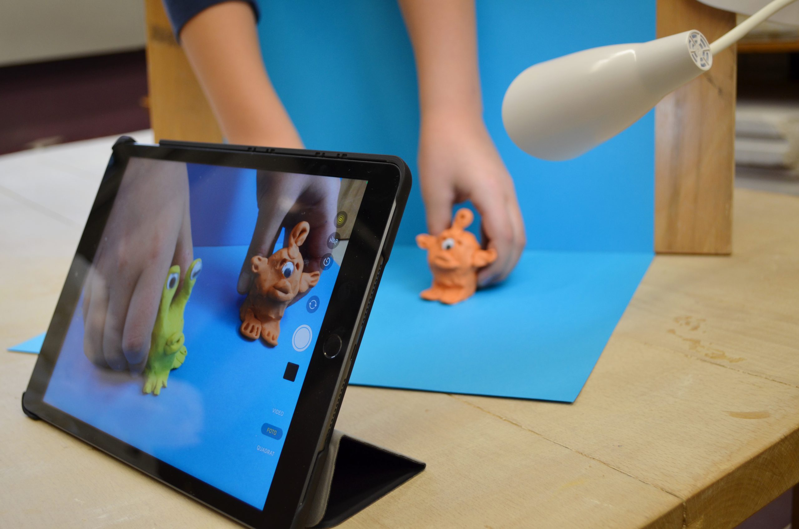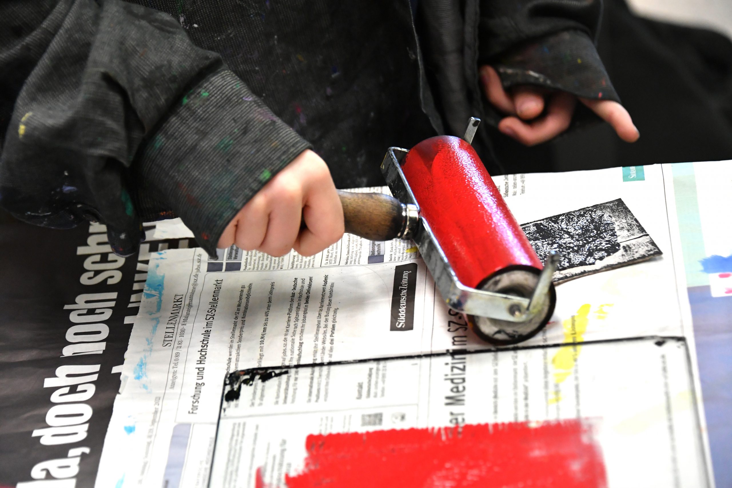 Unsere beiden Kursräume sind ausgestattet mit vielfältigen Arbeitsmaterialien wie Staffeleien für größere und kleinere Malereien, eine Druckpresse für Linolschnitte und Radierungen sowie ein Brennofen für keramische Arbeiten. Zudem sind wir an unserer Schule mit iPad- Koffern ausgestattet, mit denen auch digitale Projekte wie Stop Motion Animationen, Fotografien oder unterschiedliche Techniken der Bildbearbeitung realisiert werden können.