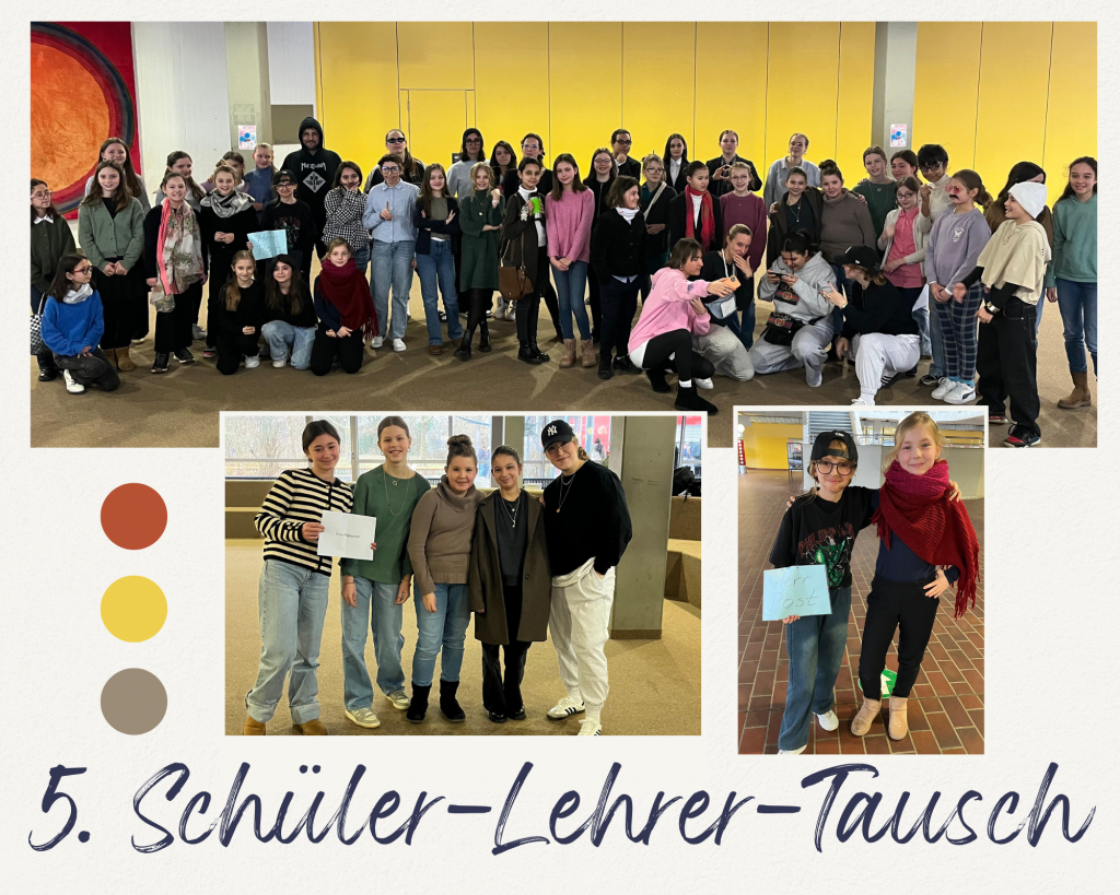 Die Mottowoche endete mit dem Schüler-Lehrer-Tausch. Hier kamen Lehrkräfte in Jogginghosen, während sich die Schülerschaft in schicken Anzügen kleidete. Besonders beliebt war dabei das Nachahmen bestimmter Lehrkräfte: Herr Post, zum Beispiel, ließ sich durch seine bunten Socken und einzigartigen Sneakers leicht erkennen.