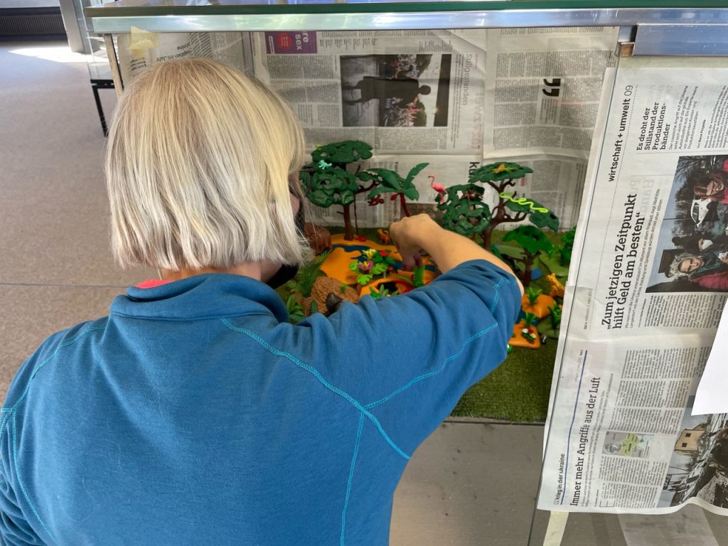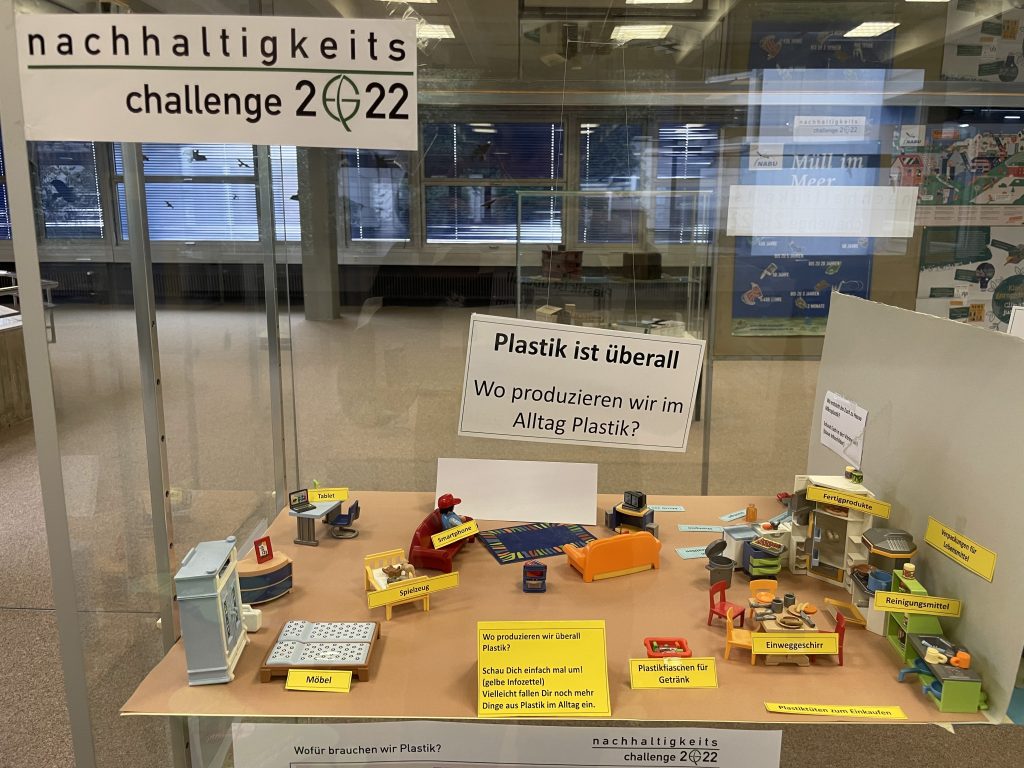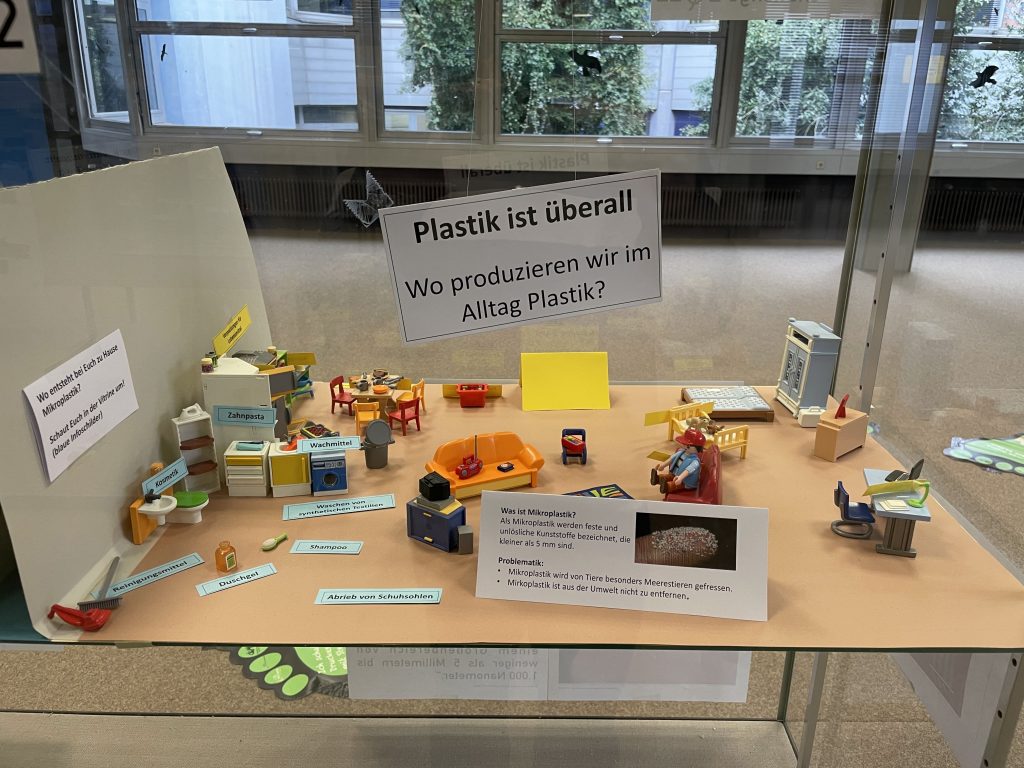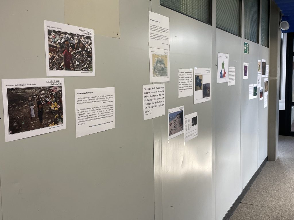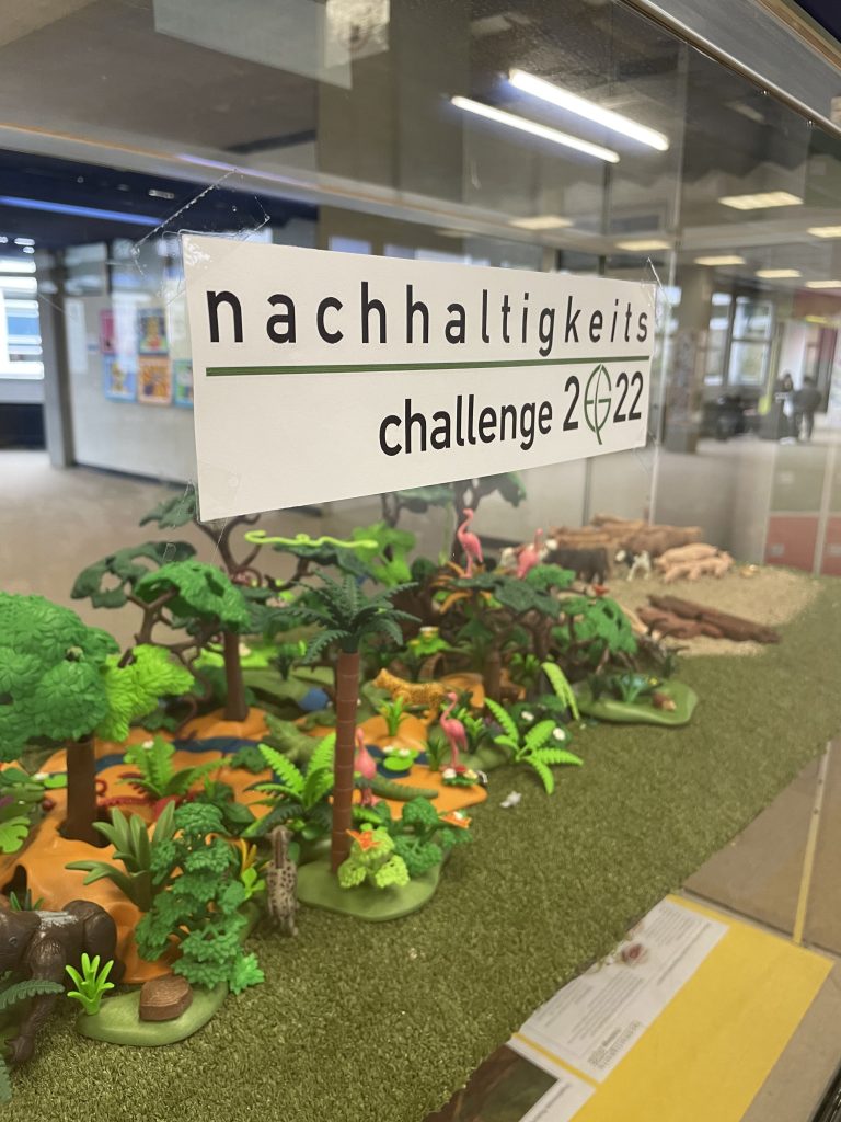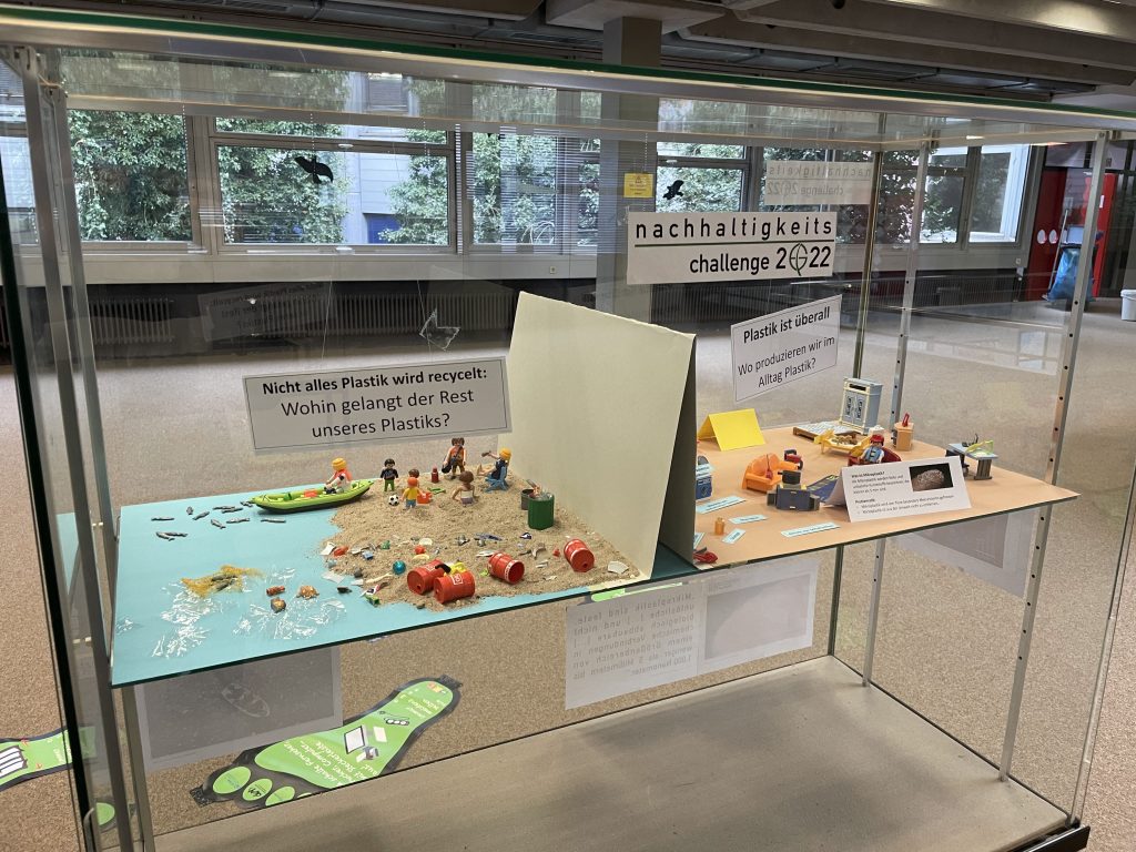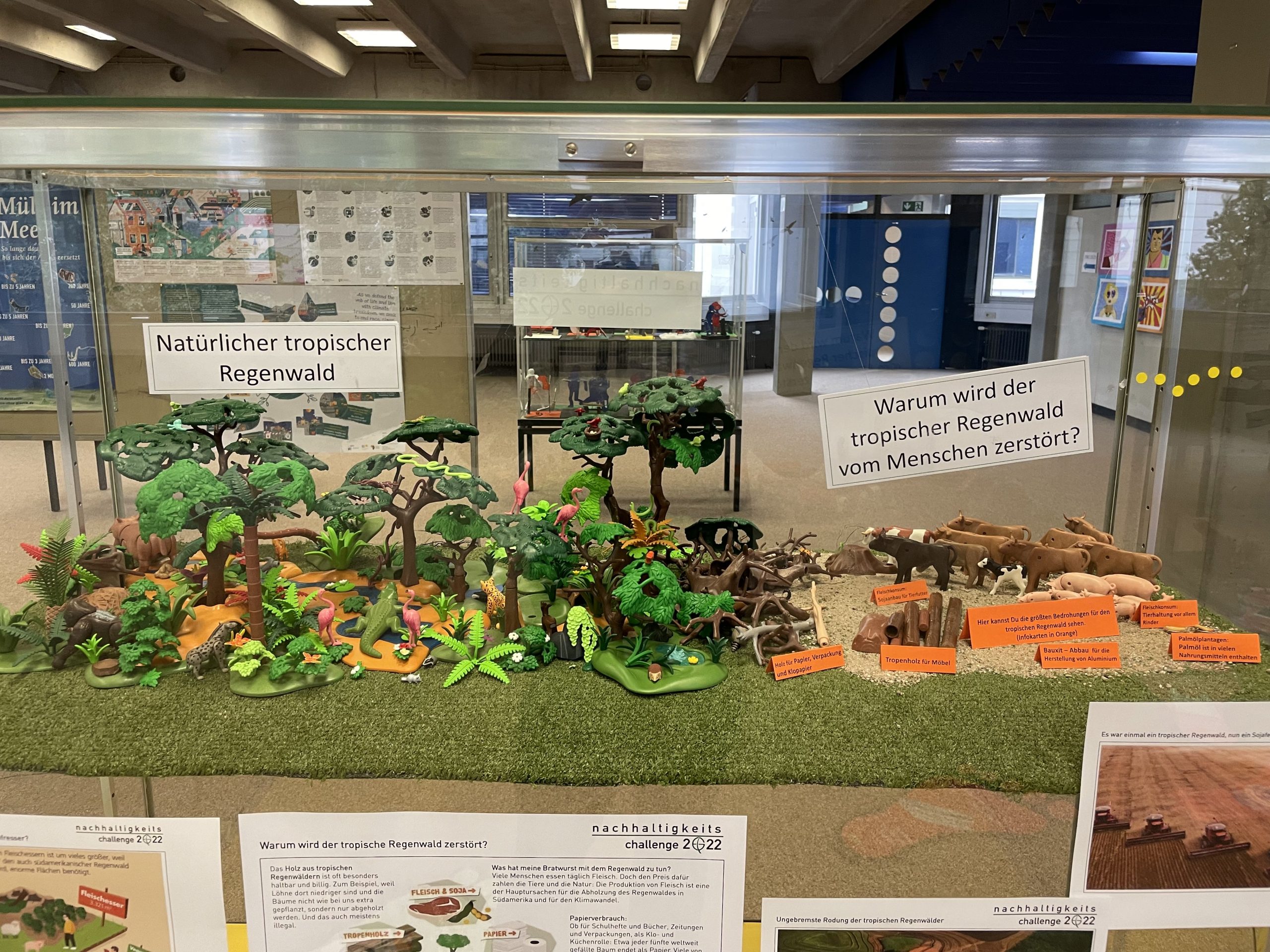 Anbei (weiter unten) findet ihr noch ein paar Fotos der Modelle in den Vitrinen, der Plakat-Infowände, des ökologischen Fußabdrucks (Fußabdruck-Bodenläufer), einiger Klassen-Ergebnisse, usw.