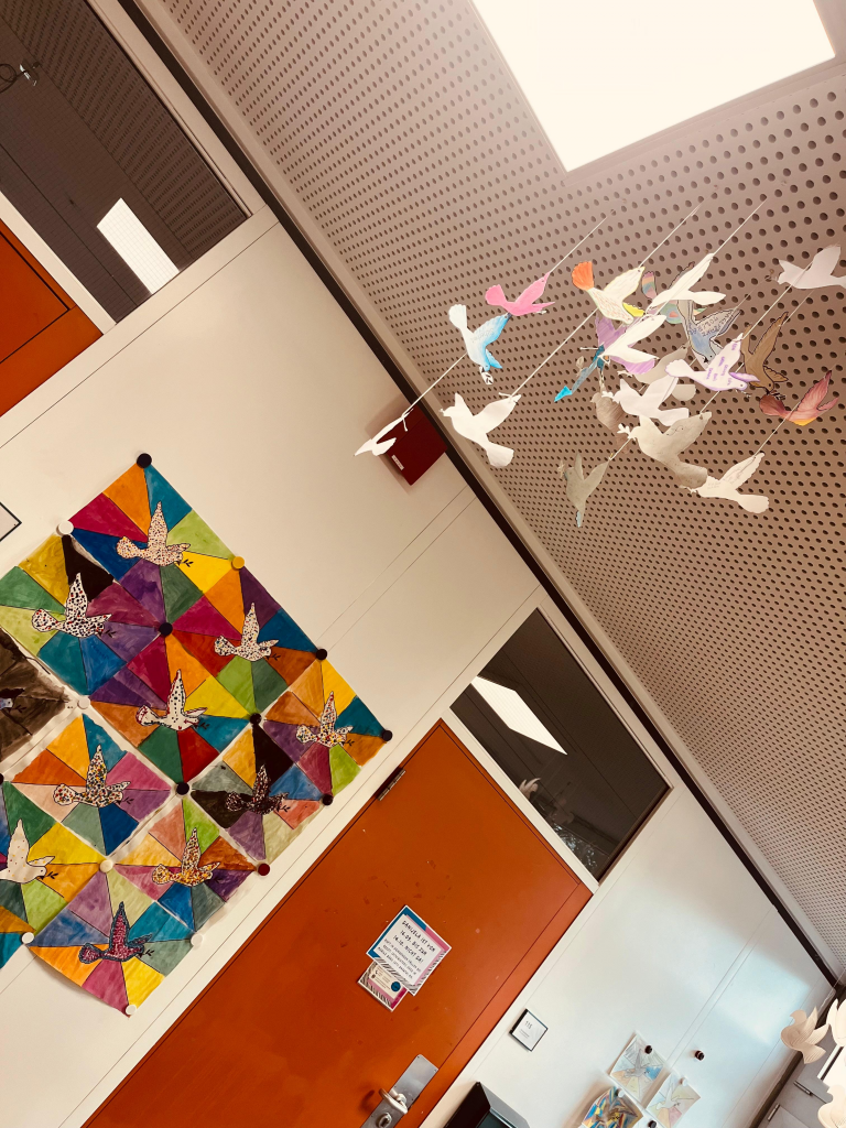 Unter dem Motto „Frieden gestalten“ haben unsere Schülerinnen und Schüler der 10. Klassen Friedenstauben beschriftet und kreativ gestaltet. Diese wurden im Flur der Kreuzstein-Schule aufgehängt und erinnern uns täglich daran, wie wichtig Frieden und Zusammenhalt in unserer Welt sind.