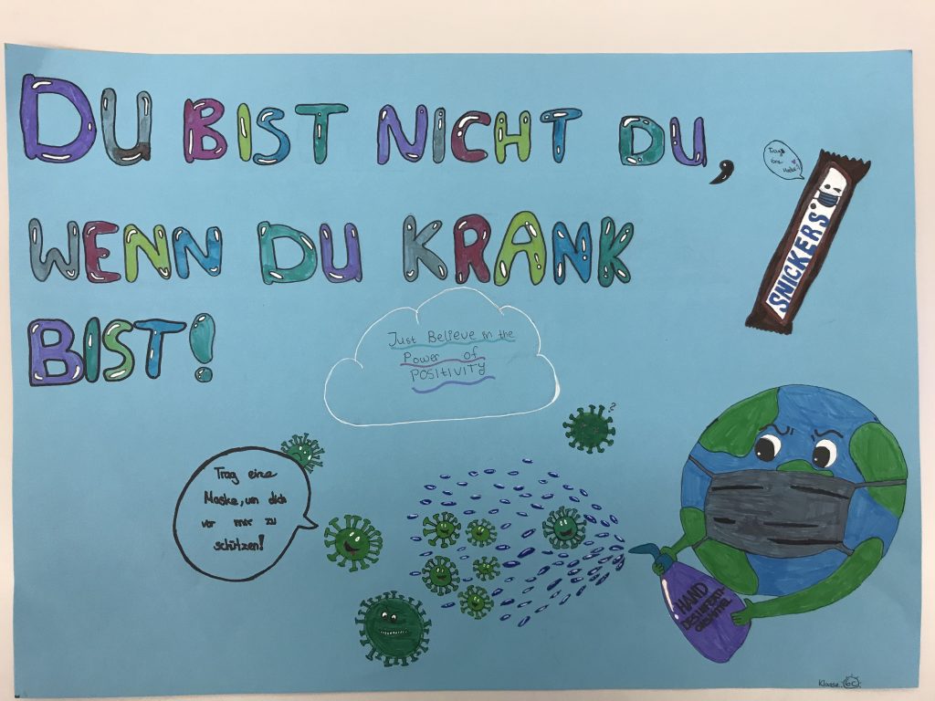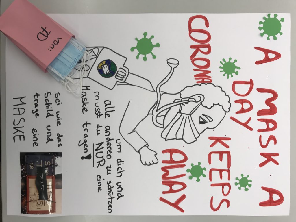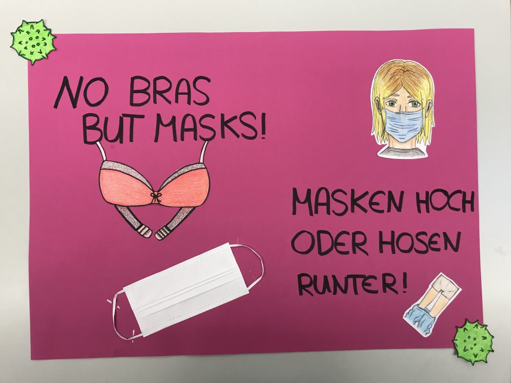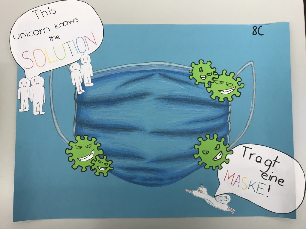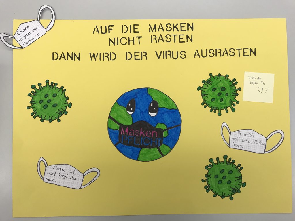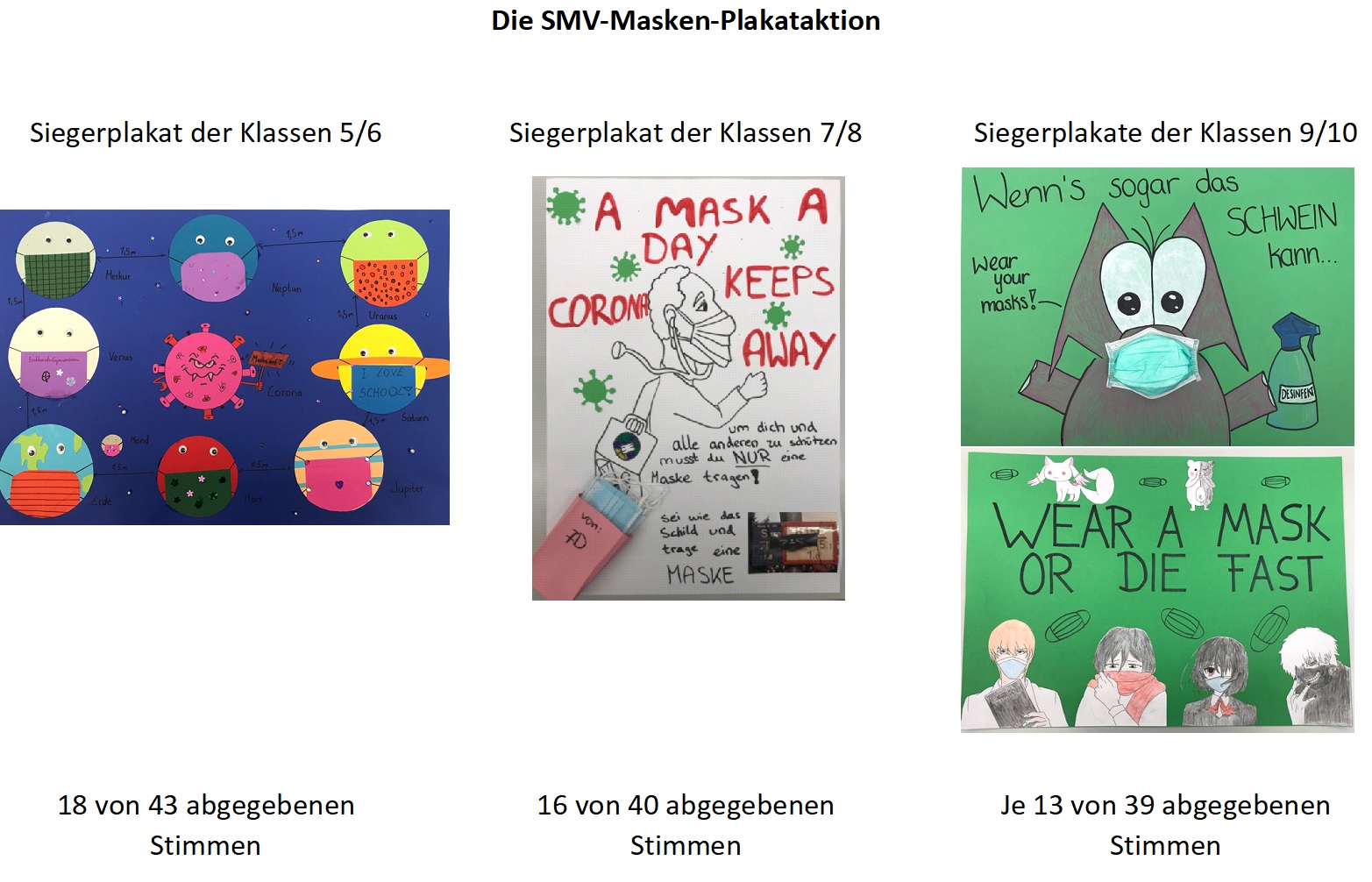 Die Pandemie hat auch uns als SMV total überrascht und unsere Arbeit verändert. Viele geliebte Aktionen mussten entfallen, welche die Schulgemeinschaft stärken sollten. Um aber nicht untätig zu bleiben, beschloss die SMV einen schulweiten Wettbewerb in Form einer Plakataktion zum Thema „Maskentragen“ durchzuführen. Anbei sind die Plakate dargestellt, wie sie lange Zeit in unserem Schulhaus zu sehen waren.